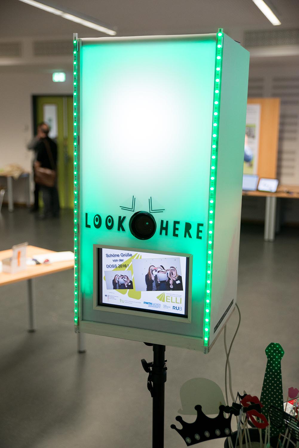 Im Gegensatz zu den meisten anderen Anbietern hat meine Fotobox den Studioblitz schon integriert. Der Effekt ist besser, als bei Blitzaufbauten oben auf der Box, da das Licht so aus Höhe der Kamera kommt und keine Augenschatten werfen kann. Und es sieht auch noch besser aus – denn Ihr könnt durch interne und äußeren LEDs eine Farbkombination festlegen oder im Zufallsmodus wechseln lassen. In der Booth sind zudem ein Touchscreenmonitor und eine Nikon Spiegelreflexkamera verbaut.